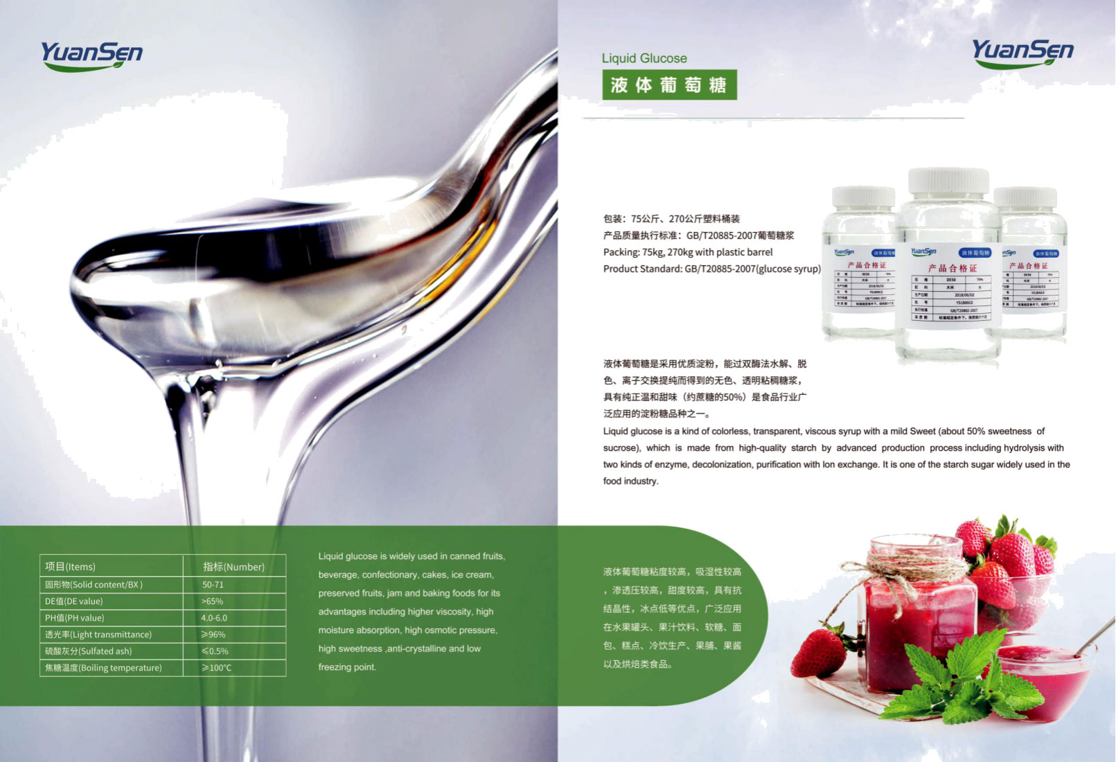 液體葡萄糖是采用優質淀粉,能過雙酶法水解、脫色、離子交換提純而得到的無色、透明粘稠糖漿,具有純正溫和甜味(約蔗糖的50%) 是食品行業廣泛應用的淀粉糖品種之一。