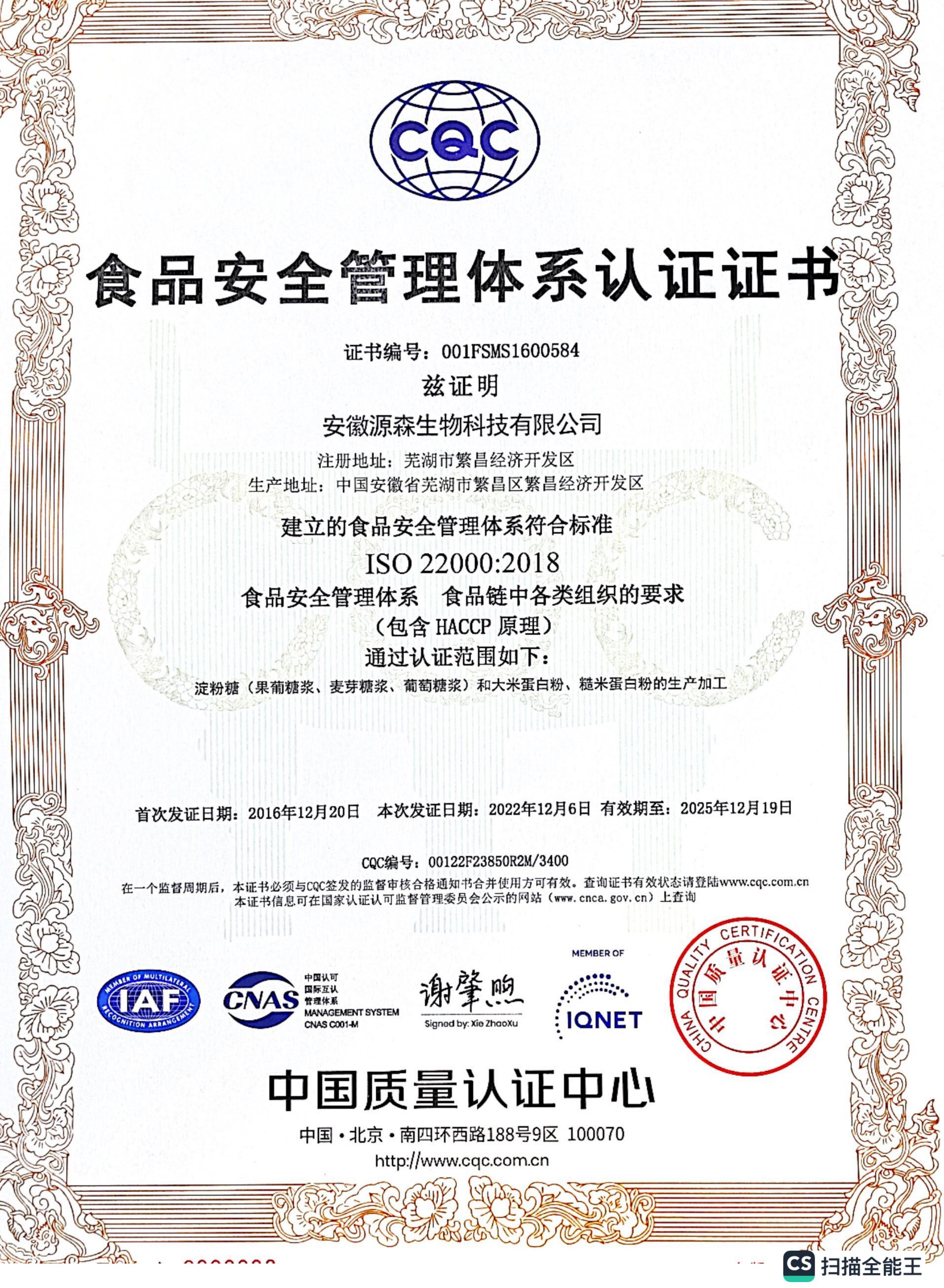 食品安全管理體系認證證書
